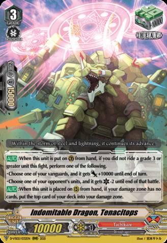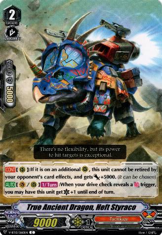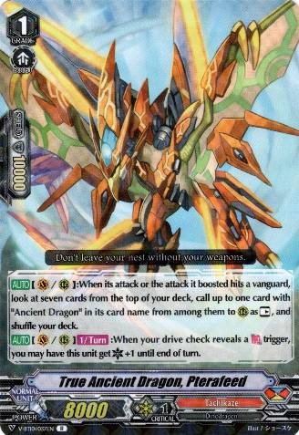 Anyway, back to Tachikaze Reverse, Spinodriver Reverse's first ability is strong, that give you free +3 without anything, and if you ride him on Second G3 turn by rode upon Non-reverse Spinodriver (The first G3 ride must be Non-reverse Spinodriver or Ancient Dragon, Tyrannolegend) you will has 4 Accel on field and can draw then call 3 to those Accel. And if you call Tyrannolegend he will give you 1 Front Trigger in your first check, that will give all of your Ancient Dragon in front row +1 crit by Spinodriver Reverse's second ability and +1 crit by their own ability. This mean your Front Trigger is just like a Crit Trigger but + to all Ancient Dragon.