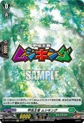 This deck also requires a Mushiking Cabinet Crest, which you get on your first ride, so be sure to look that up. It lets you put 3 set orders of different grades and Move types (top-left RPS icons) into your order zone straight from deck. You can't play any orders except through the crest. 1/turn, sb1 to grab a Bug or Move from the top 5 of your deck.